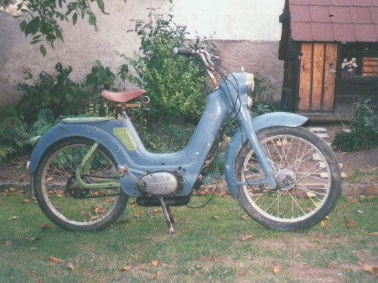 Tohoto mopeda jsem koupil za 1 800,- Kč na podzim roku 2003. Jawettce chybělo táhlo k zadní brzdě, něměla pár originálních dílů, ale stačilo vyčistit karburátor a byla připravena vyrazit do ulic. Jelikož je ale lak ve špatném stavu, bude v budoucnu nastříkán do originální světle modré barvy se zlatými linkami. |